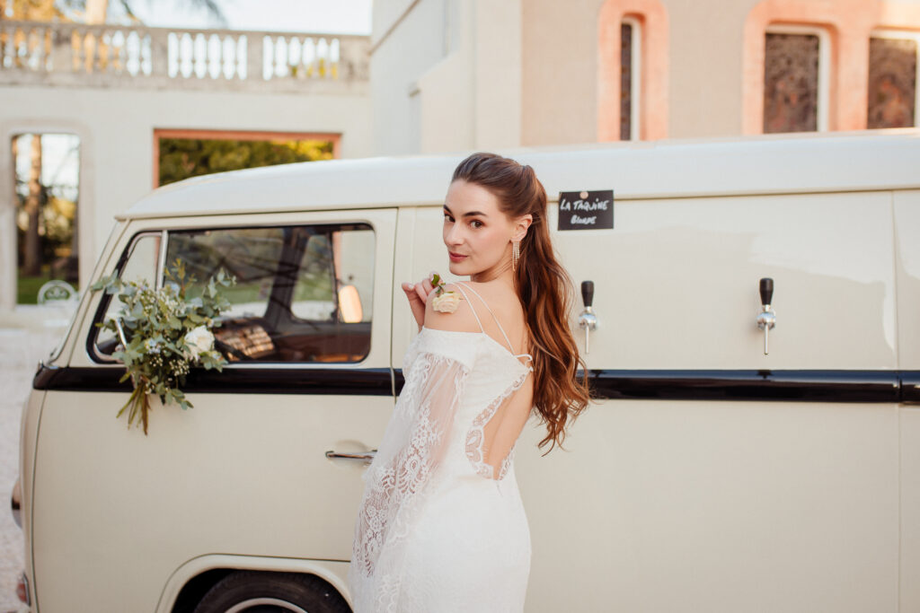 Pour une arrivée encore plus iconique, cette formule associe notre combi bar à une coccinelle de collection avec chauffeur (également géré par nos soins).
